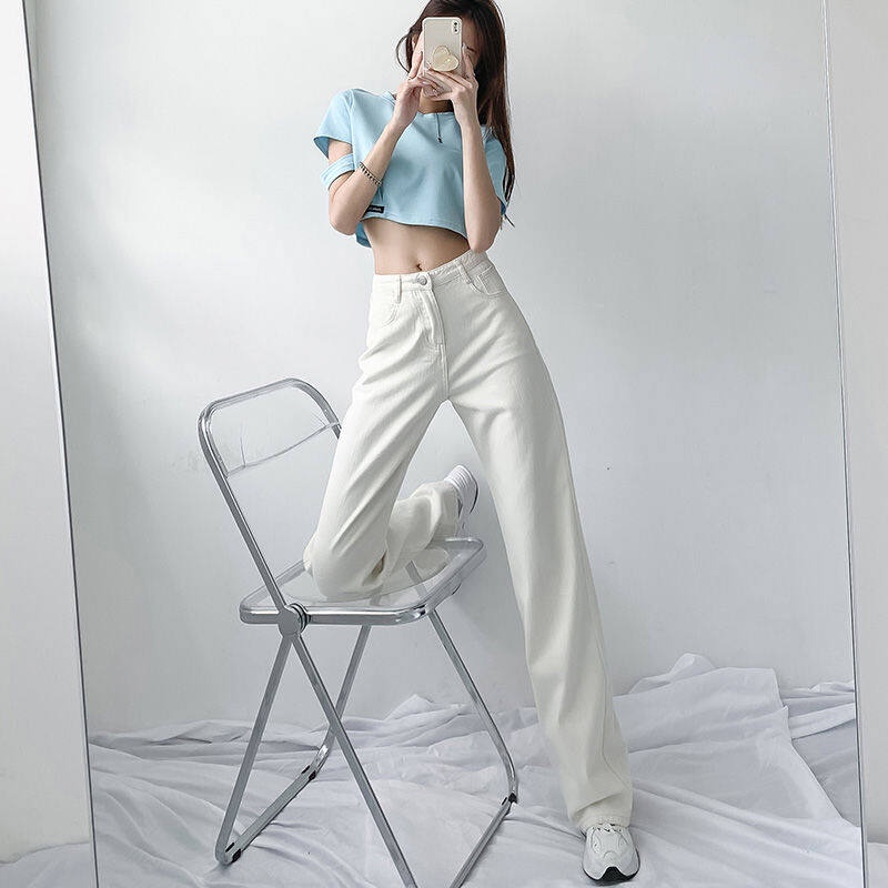 Quần jeans dài IELGY lưng cao ống rộng màu trắng cá tính cho nữ