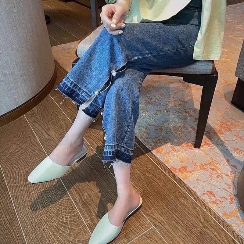 Quần jeans nữ ống suông xẻ gấu đính ngọc trai phong cách trẻ trung cho nữ