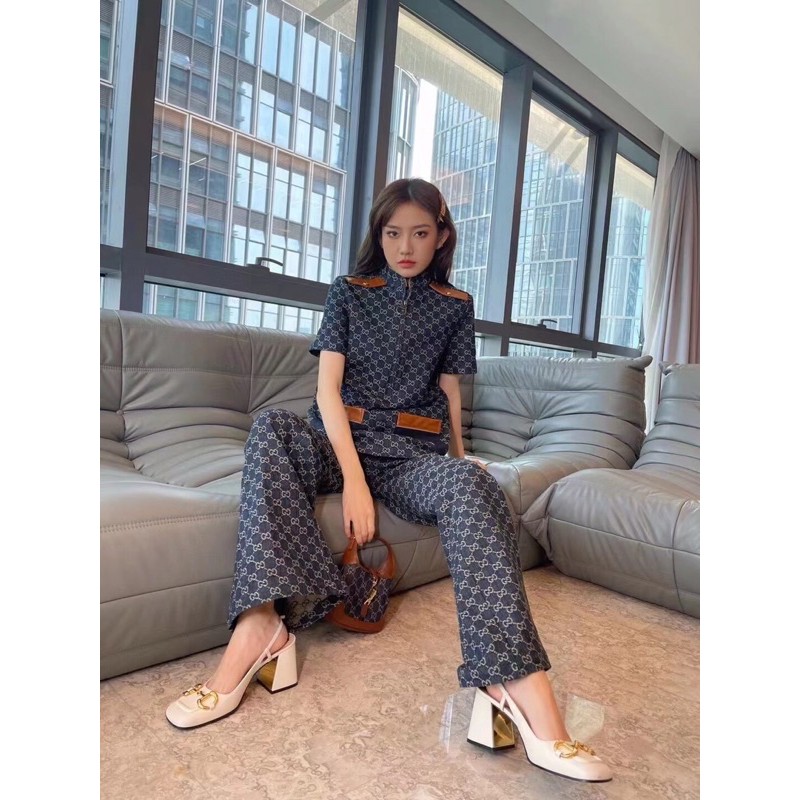 Quần jieans ống rộng Gucci GC màu xanh dương họa tiết kẻ caro
