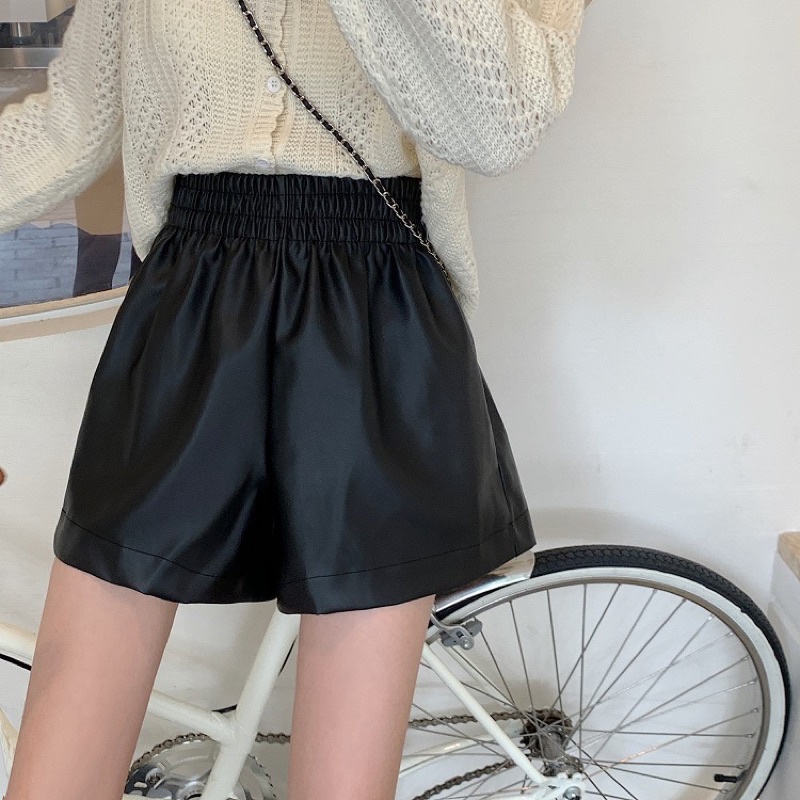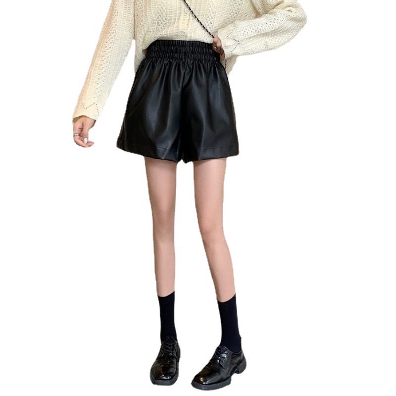Quần short đùi ngắn trên gối, chất liệu da, lưng chun, cạp cao co giãn, đen nâu.