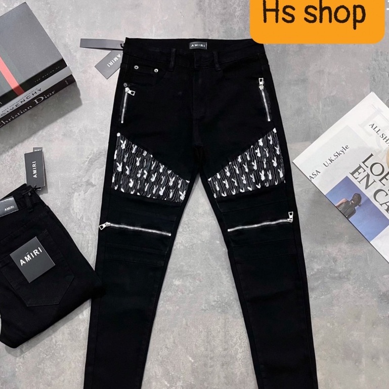 Quần bò jean nam dài amiri đen rách gối vá thỏ phối khóa kéo lệch kiểu đẹp,chất jean co giãn tốt