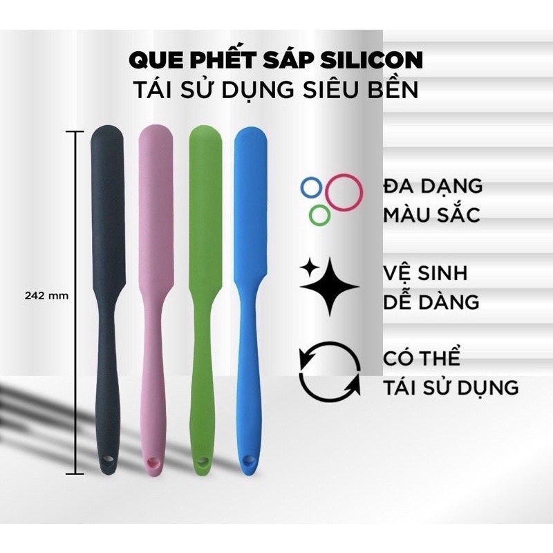 Que phết sáp wax lông silicon siêu bền Đặc điểm: - Kích thước phù hợp: phù hợp với hầu hết các ứng dụng, nó cóTay cầm dài, bề mặt nhẵn, không chỉ giữ và kiểm soát sự thoải mái mà còn ngăn ngừa tẩy lông bám bẩn tay bạn. - Có thể tái sử dụng: cạp silicone có thể dễ dà
