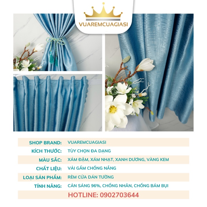 Rèm cửa dán tường, rèm cửa 1 lớp chống nắng cao cấp không khoan đục Hiện nay trên thị trường có rất nhiều sản phẩm rèm cửa dán tường khác nhau nhưng đa phần chủ yếu nhập khẩu từ Trung Quốc, với chất liệu vải mỏng, độ chống nắng thấp, dễ bị bong ra khi dán và độ bền không cao sau thời gian dài sử dụng. Hiểu được tâm lý và mong muốn của khách hàng là có được 1 tấm rèm chất lượng, cao cấp và giá rẻ phù hợp với nhu cầu của người tiêu dùng Việt, vuaremgiasi cho ra mắt sản phẩm rèm dán đa năng trên mọi bề mặt. Với hơn 15 năm kinh nghiệm trong sản xuất rèm cửa, vuaremgiasi cam kết mang đến cho quý khách khách hàng những sản phẩm hoàn thiện từ đường kim mũi chỉ, phụ kiện may cao cấp, chất liệu và độ cản sáng tốt đi cùng với uy tín và dịch vụ tốt nhất cho khách hàng. Ưu điểm của rèm cửa dán tường: - Không cần khoan tường hay thanh treo tốn kém - Lắp đặt trong 5 phút, vệ sinh tháo gỡ dễ dàng - Rèm được may và dập biên, mang đến độ thẩm mĩ và phù hợp cho mọi không gian phòng khác nhau, rèm cửa sổ, rèm cửa chính, ngăn tường,... - Rèm dán họa tiết nhã nhặn phù hợp trang trí phòng ngủ, decor phòng theo ý thích mà không làm hỏng tường. Hướng dẫn sử dụng: - Chỉ dán rèm cửa trên bề mặt tường sơn nhẵn mịn, kính, gỗ - Không dán rèm lên các bề mặt gồ ghề, xốp dán tường, giấy dán tường,..sẽ làm giảm độ bám dính của sản phẩm Bộ sản phẩm bao gồm: - 1 rèm dán may hoàn thiện - Keo dán tường - Tặng dây buộc rèm của vuaremgiasi Lưu ý: Có thể dùng 2 rèm dán cho 1 cửa để tạo sóng và kéo sang 2 bên sẽ đẹp và sang trọng hơn, nên chọn chiều ngang rèm dài hơn cửa để rèm che hết cửa và tạo độ xếp ly. CAM KẾT - Sản phẩm đúng với mô tả. - Số lượng tồn kho được cập nhật chính xác 100%. - Được phép đổi trả nếu có lỗi của nhà sản xuất. - Thời gian chuẩn bị hàng siêu tốc trong vòng 24h. Cảm ơn quý khách hàng đã tin tưởng và sử dụng sản phẩm của vuaremgiasi trong thời gian vừa qua, hy vọng với sản phẩm rèm dán tiện lợi này sẽ mang đến một không gian mới cho gia đình bạn. #remdan #remcua #remchongnang #remdep #rem #remdantuonggiare #remtrangtri #remvoan #remtreocua #remphongngu #remdancuaso #remcuadep #remchenang #remcuagiare #remspa #remvai #remvai2lop #remdantuongkhongcankhoan