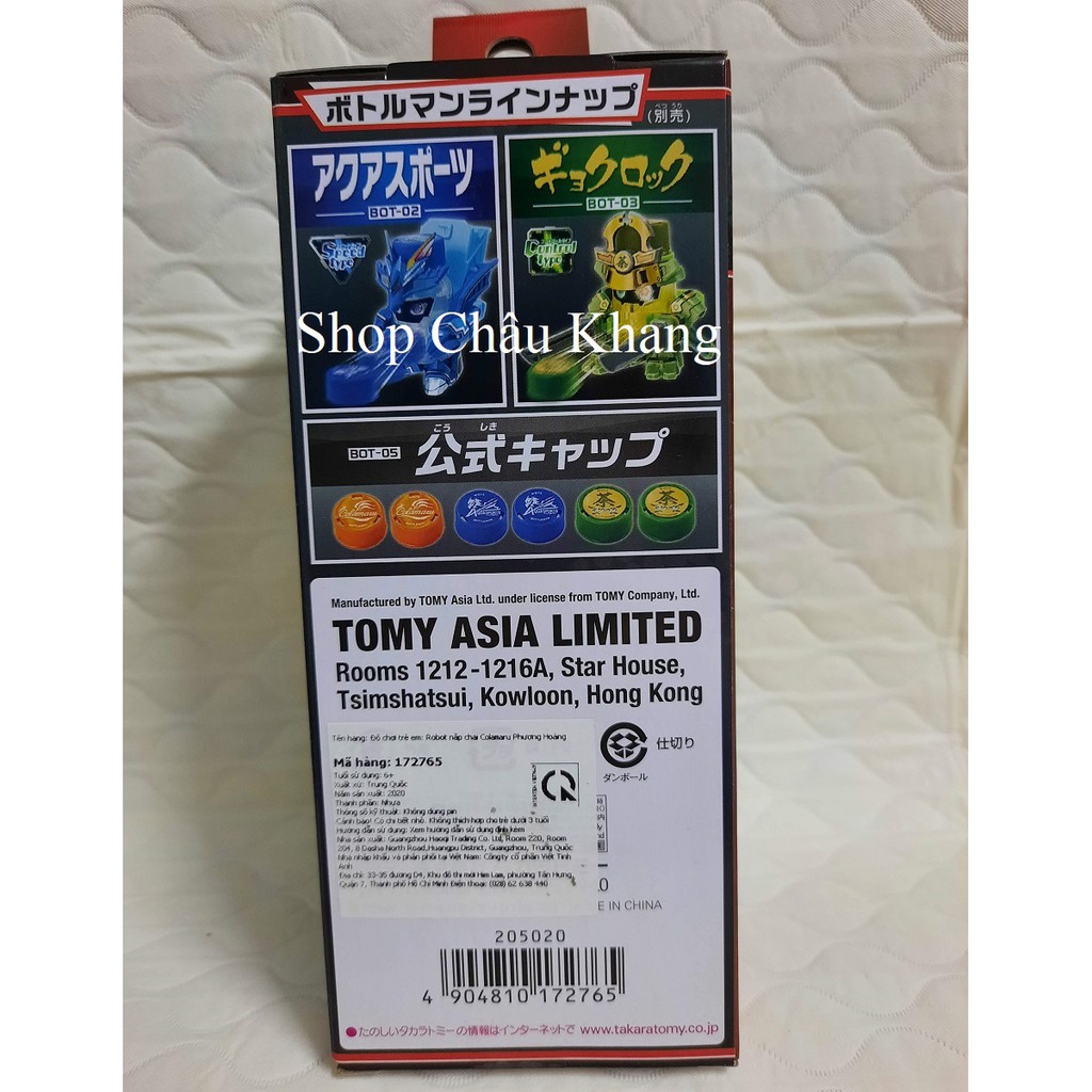Robot Nắp Chai Colamaru Phượng Hoàng (Chiến Vương Nắp Chai Bottleman BOT-01) THÔNG TIN SẢN PHẨM: - Độ tuổi phù hợp: Trẻ từ 6 tuổi trở lên. - Chất liệu: Nhựa cao cấp, không chứa BPA nên an toàn cho bé khi chơi. - Thông số kỹ thuật: Không dùng pin. - Xuất xứ: Trung Quố