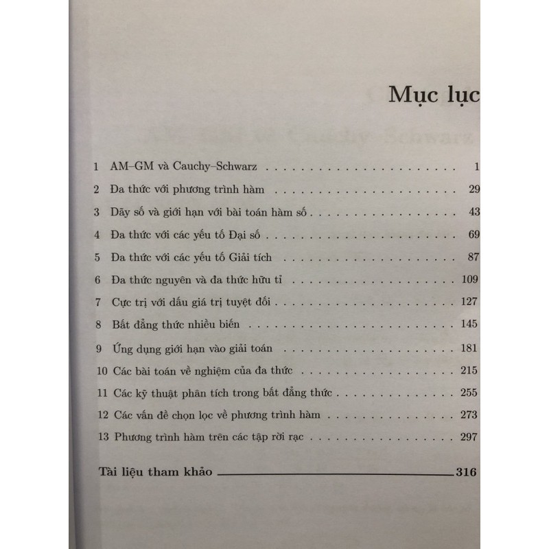 Nội dung gồm có: 1. AM - GM và Cauchy - Schwarz 2. Đa thức với phương trình hàm 3. Dậy số và giới hạn với bài toán hàm số 4. Đa thức với các yếu tố Đại số  5. Đa thức mới các yếu tố giải tích 6. Đa thức nguyên và đa thức hữu tỉ 7. Cực trị với dấu giá trị tuyệt đối 8. Bất đẳng thức nhiều biến 9. Ứng dụng giới hạn vào giải toán 10. Các bài toán về nghiệm của đa thức 11. Các kĩ thuật phân tích trong bất đẳng thức 12. Các vấn đề chọn lọc về phương trình hàm 13. Phương trình hàm trên các tập rời rạc Tác giả: Lê Anh Vinh, Nguyễn Huy Tùng, Nguyễn Thế Hoàn, Nguyễn Văn Quý, Lê Phúc Lữ, Võ Quốc Bá Cẩn, Nguyễn Huy Trung, Lê Quang Dũng Số trang: 316 Xuất bản: 2022 Nhà xuất bản: Đại học quốc gia Hà Nội Công ty phát hành: Nxb Đại học quốc gia Hà Nội