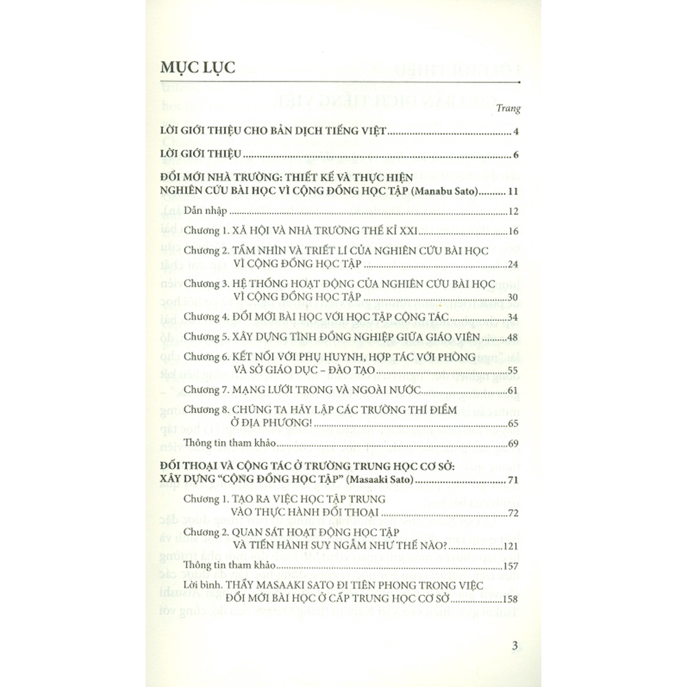 Sách - Cộng Đồng Học Tập - Mô Hình Đổi Mới Toàn Diện Nhà Trường Tác giả Manabu Sato - Masaaki Sato Nhà xuất bản NXB Đại Học Sư Phạm Đơn vị phát hành NXB Đại Học Sư Phạm Ngày xuất bản 08-2021 Số trang 168 Kích thước 13 x 20.5 cm Loại bìa Bìa mềm Nội dung Cuốn sách này là sự kết hợp từ một cuốn sách của Giáo sư Manabu Sato và hai chương sách của thầy Masaaki Sato. Cuốn sách đầu tiên “Đổi mới nhà trường: Thiết kế và thực hiện Nghiên cứu bài học vì cộng đồng học tập” của Giáo sư Sato mô tả chi tiết tầm nhìn, triết lí và hệ thống hoạt động của Nghiên cứu bài học vì cộng đồng học tập (NCBHCĐHT). Nó cung cấp nền tảng lí luận vững chắc cho NCBHCĐHT, giúp người đọc hiểu những ý tưởng đằng sau mô hình đổi mới nhà trường này. Cuốn sách thứ hai “Đối thoại và cộng tác ở trường trung học cơ sở: Xây dựng cộng đồng học tập” được viết bởi tác giả Masaaki Sato gồm có ba chương: Chương đầu tiên là một chương sách tuyệt vời nhưng chúng tôi không giới thiệu ở bản dịch tiếng Việt vì nó trùng lặp với cuốn sách của Giáo sư Sato; Hai chương tiếp theo để cập đến kĩ năng thực hiện NCBHCĐHT, tập trung vào chủ đề đối thoại và cộng tác với những ví dụ phân tích cụ thể từ các bài học mà tác giả trực tiếp tham dự khi cố vấn cho các trường học ở Nhật Bản xây dựng mộ hình NCBHCĐHT. Mặc dù những ví dụ được đưa ra trong bối cảnh nhà trường trung học cơ sở (THCS), chúng vẫn còn nguyên giá trị đối với các cấp học khác.
