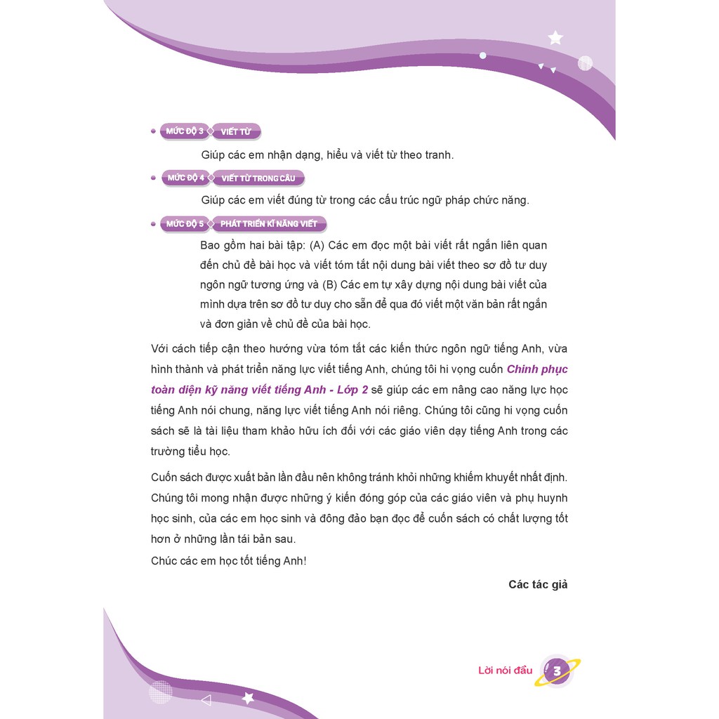 Công ty phát hành: Công ty cổ phần CCGroup toàn cầu Nhà xuất bản: NXB Đại học Quốc gia Hà Nội Kích thước: 19*26 cm Tác giả: Ths. Nguyễn Quốc Tuấn, Nguyễn Quốc Anh. Ngày xuất bản: 03/2019 Chinh phục toàn diện kĩ năng viết tiếng Anh lớp 2 là cuốn sách nằm trong bộ luyện viết tiếng Anh do NXB Đại học Quốc gia Hà Nội phối hợp cùng CCBook phát hành. Sách được chắp bút bởi chủ biên SGK tiếng Anh cấp 1- thạc sĩ Nguyễn Quốc Tuấn. Đây là sách luyện viết đầu tiên đi sâu vào kĩ năng viết giúp học sinh tiểu học nâng cao khả năng sử dụng tiếng Anh. Chinh phục toàn diện kĩ năng viết tiếng Anh lớp 2 nội dung bám sát chương trình sách giáo khoa hiện hành, nhưng đi sâu vào phát triển kỹ năng viết tiếng Anh cho học sinh. Đặc biệt là học sinh lớp 1 mới làm quen với tiếng Anh tiểu học. Để học sinh yêu thích học tiếng Anh và tiến bộ nhanh hơn trong học tập, cuốn sách đã chia mỗi bài học thành 5 cấp độ từ dễ đến khó: Cấp độ 1 - Viết chữ. Cấp độ 2 - Viết chữ trong từ. Cấp độ 3 - Viết từ. Cấp độ 4 - Viết từ trong câu. Cấp độ 5 - Phát triển kỹ năng viết. Sách có nhiều hình ảnh sinh động, gợi sự liên tưởng làm tăng tình yêu tiếng Anh trong trẻ Nhiều học sinh thường cảm thấy chán khi bắt đầu học những phần kiến thức khó, phức tạp. Trong đó viết tiếng Anh là một kĩ năng khó có thể khiến các em nản, bỏ dở. ĐỐI TƯỢNG SỬ DỤNG sách “”chinh phục toàn diện kỹ năng viết tiếng Anh lớp 2” – Các em học sinh lớp 2 – Phụ huynh sử dụng để con luyện tập thêm ở nhà. – Giáo viên, gia sư sử dụng làm tài liệu giảng dạy.