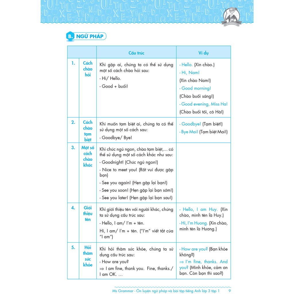 Ms Grammar Ôn luyện Ngữ pháp và Bài tập tiếng Anh lớp 3 là cuốn sách ôn luyện ngữ pháp và bài tập Tiếng Anh dành cho học sinh lớp 3. Đây là bộ sách về ngữ pháp Tiếng Anh đầu tiên trên thị trường dành cho học sinh tiểu học Việt Nam, với mong muốn giúp các em học sinh c