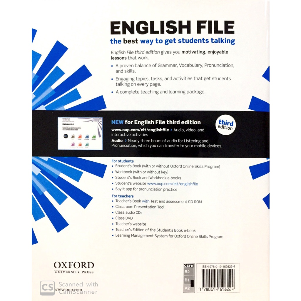 Công ty phát hành: Oxford University Press Nhà xuất bản: Oxford University Press Elt Tác giả: Clive Oxenden Loại bìa: Bìa Mềm Số trang: 95 Năm xuất bản: 2019 English File: Pre-intermediate. Workbook with key and iChecker The best way to get students talking . English File third edition gives you motivating, enjoyable lessons that work. A proven balance of Grammar, Vocabulary, Pronunciation, and skills. Engaging topics, tasks, and activities that get students talking on every page. A complete teaching and learning package. New for English File third edition : oup.com/elt/englishfile - Audio, video, and interactive activities ; Audio - Nearly three hours of audio for Listening and Pronunciation, which you can transfer to your mobile devices. For students : Students Book (with or without Oxford Online Skills Program), Workbook (with or without key), Student's Book and Workbook a-books, Students website oup.com/elt/englishfile, Say It app for pronunciation practice. For teachers : Teacher's Book with Test and assessment CD-ROM, Classroom Presentation Tool, Class audio CDs, Class DVD, Teacher's website, Teacher's Edition of the Student's Book a-book, Learning Management System for Oxford Online Skills Program.