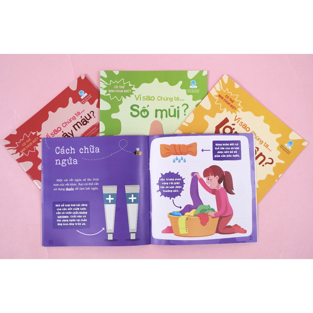 Có thể bạn chưa biết – Vì sao chúng ta…. bộ 12 cuốn --------------------------- Công ty phát hành Đinh Tị Tác giả Emilie Dufresne Nhà xuất bản Nhà Xuất Bản Thanh Niên Ngày xuất bản 01-2021 Kích thước 20.5 x 20.5 cm Loại bìa Bìa mềm Số trang 24/ cuốn --------------------------- Bộ sách vô cùng thú vị, sẽ giúp các bạn giải đáp được tất tần tật những thắc mắc về cơ thể của chính mình. Trong đó, những cuốn sách đáng yêu này sẽ giúp các bạn trả lời được các câu hỏi như : Vì sao chúng ta…. ngủ? Vì sao chúng ta…. lớn lên? Vì sao chúng ta….chảy máu? Vì sao chúng ta…. bị bong da? Vì sao chúng ta…. đại tiện? Vì sao chúng ta…. bị ngứa? Vì sao chúng ta…. sổ mũi? Vì sao chúng ta…. toát mồ hôi? Vì sao chúng ta…. bị nôn? Vì sao chúng ta…. tiểu tiện? Vì sao chúng ta…. khóc? Vì sao chúng ta…. chảy nước miếng? Với cách trình bày dễ hiểu, bộ sách sẽ giải thích "nguồn cơn" những hiện tượng thường gặp của cơ thể như đổ mồ hôi, nôn, sổ mũi, bong da... Không chỉ có vậy, bộ sách này còn đưa ra những lý giải, chỉ dẫn giúp trẻ biết cách tự chăm sóc bản thân mình thật tốt. Mỗi chủ đề đều được diễn giải ngắn gọn, súc tích. Cùng với đó là những hình minh họa vô cùng ấn tượng, chắc chắn sẽ khiến trẻ phải tò mò, "khúc khích" cả ngày. --------------------------- 🏘 Play With Me luôn cam kết: ☑ Đảm bảo chất lượng, hàng thật 100% ☑ Ship COD toàn quốc ☑ Cam kết sách chuẩn. Nói KHÔNG với sách lậu