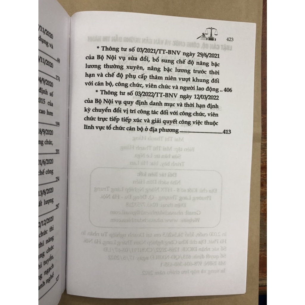 SÁCH LUẬT CÁN BỘ, CÔNG CHỨC VÀ VĂN BẢN HƯỚNG DẪN THI HÀNH Tác giả: Nhiều tác giả Nhà xuất bản: NXB Lao động Nhà phát hành: Dân Hiền Năm xuất bản: 2022 Bìa sách: Bìa mềm Khổ sách: 16 x 24 Số trang: 424 Luật cán bộ, công chức số 22/2008?QH12 ngày 13 tháng 11 năm 2008