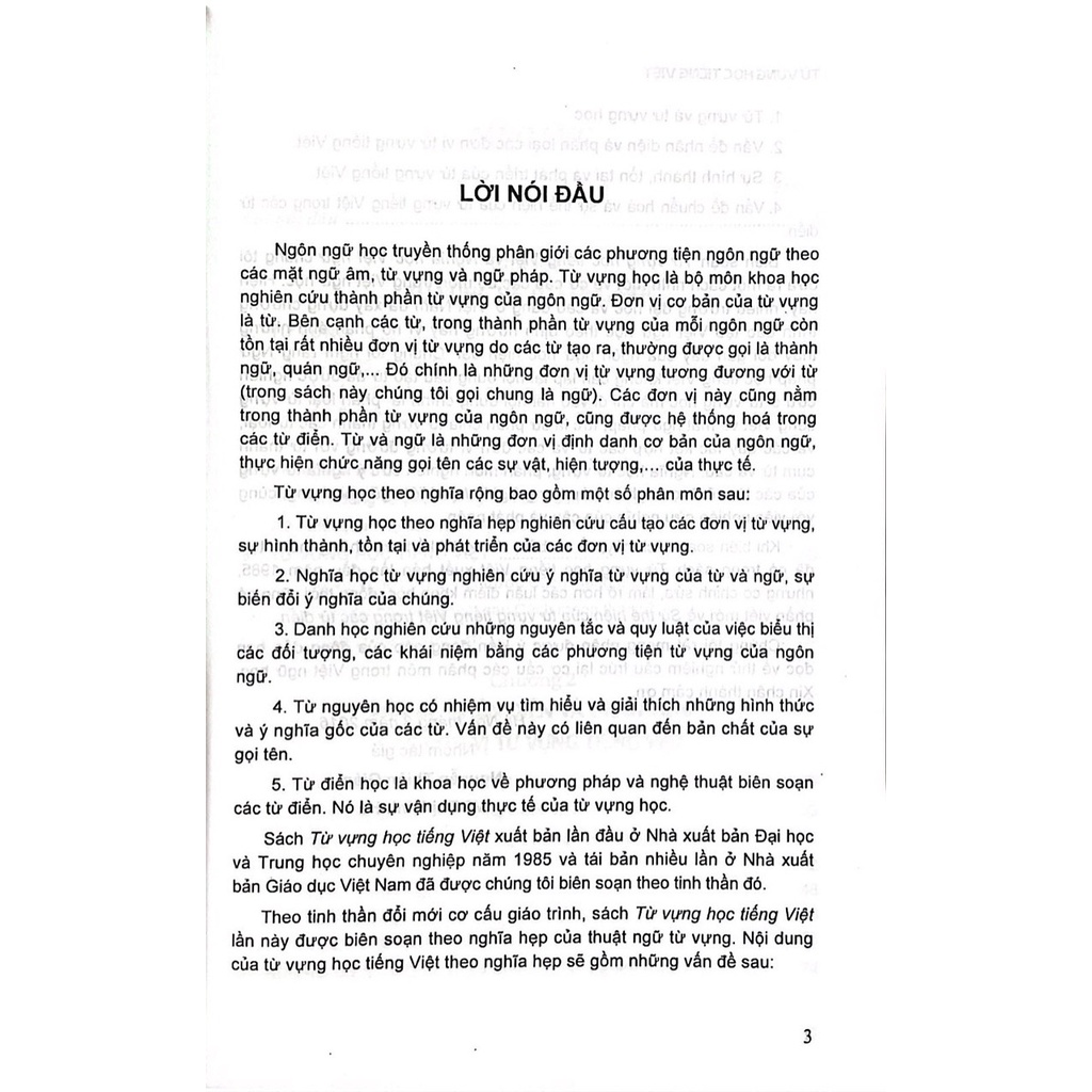 Sách - Từ Vựng Học Tiếng Việt Tác giả Nhiều Tác Giả Nhà xuất bản NXB Giáo Dục Việt Nam Đơn vị phát hành NXB Giáo Dục Việt Nam Ngày xuất bản 2016 Số trang 244 Kích thước 16 x 24 cm Loại bìa Bìa mềm Nội dung 61 Ngôn ngữ học truyền thống phân giới các phương t