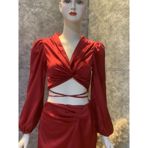 Sét áo lụa cổ xoắn buộc dây phối chân váy chéo xẻ tà