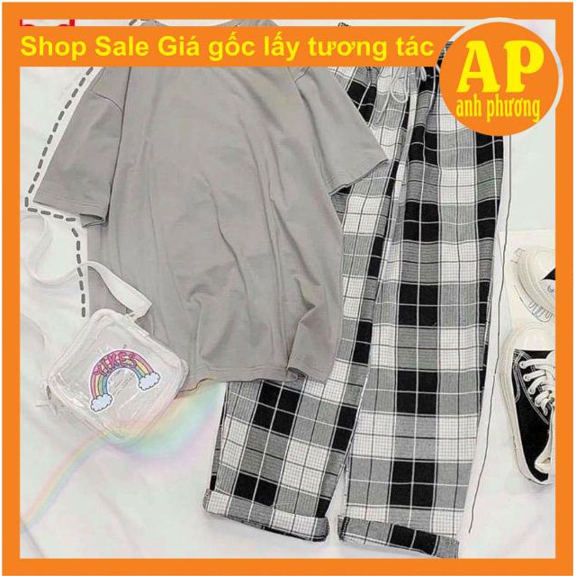 Sét áo phông Trơn + quần kẻ☝áo kiểu unisex from thụng chất đẹp☝quần lưng thun vải thể thao chất thể thao☝mát mẻ☝