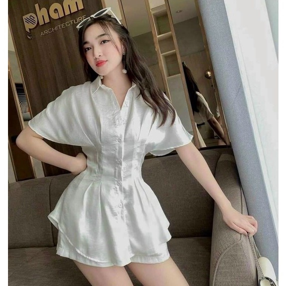 Sét bộ đùi áo cổ sơ mi cài nút ôm eo tay ngắn phối quần đùi phù hợp phong cách mùa hè chất liệu tuyết nhung 4 màu