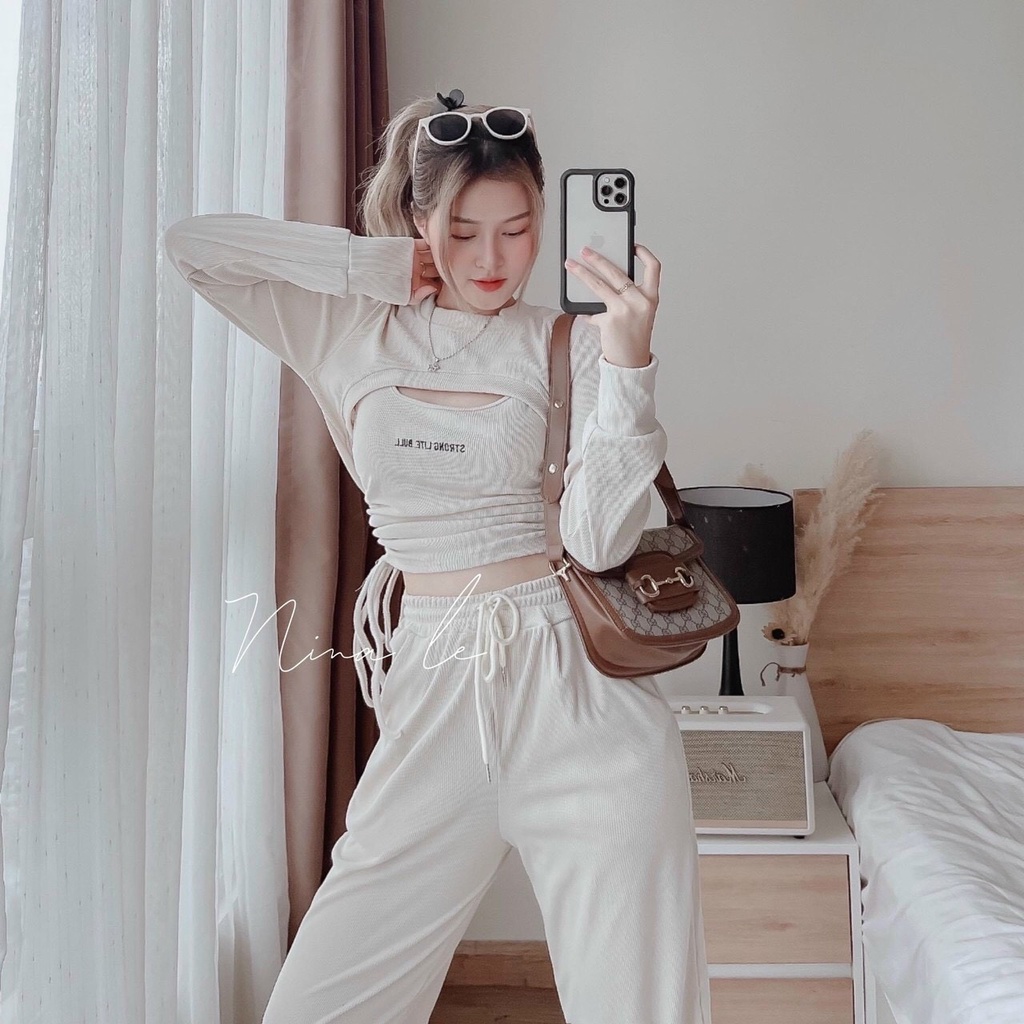 Sét Bộ Đồ Nữ Chất Thun Gân 3 Món Tay Dài Mix Áo Trong Bra Phối Quần Dài Bo Cổ Chân Thiết Kế Sang Chảnh Đi Chơi, Du Lịch