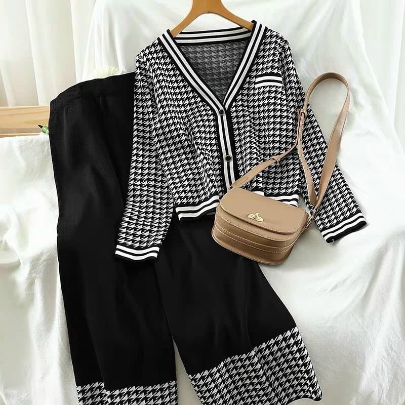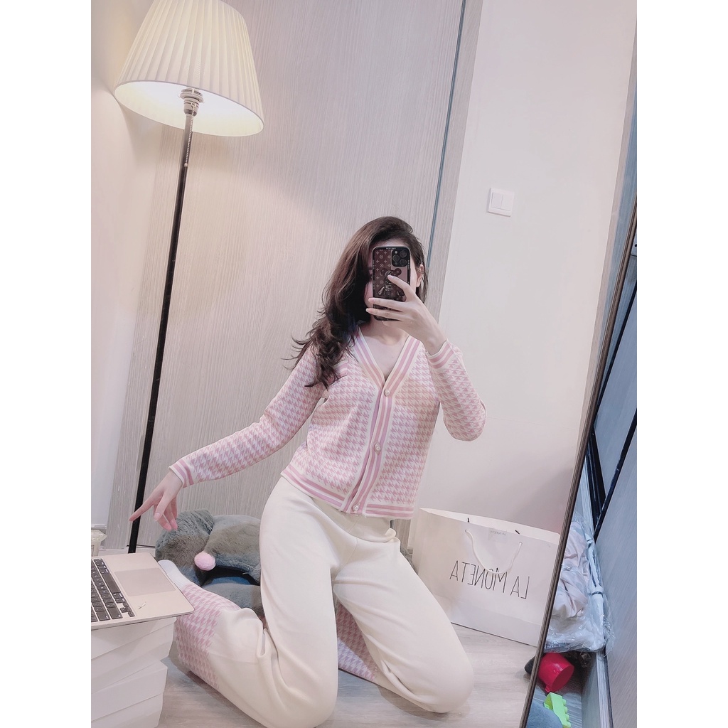 SÉT LEN KẺ ÁO CỔ V QUẦN SUÔNG CHO NỮ