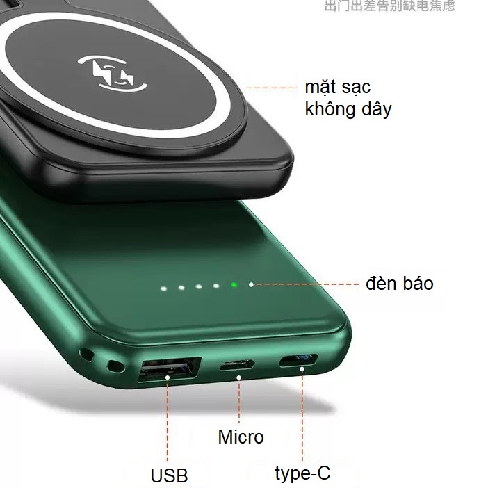 - Sạc không dây từ tính 5000mAh hỗ trợ tốt nhất cho các máy ip12 trở lên - Ngoài ra vẫn có thể sạc không dây cho các dòng ip8,X,XS,11 và các điện thoại khác - Với 3 cổng sạc cắm dây giúp sạc thiết bị của bạn nhanh hơn so với sạc không dây - Cam kết sản phẩm đúng như ả