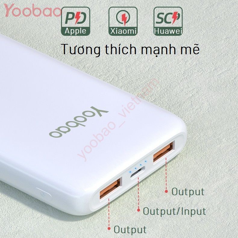 Sạc Dự Phòng Chính Hãng Yoobao 10000mAh Model D10Q - Bảo Hành 12 Tháng - Pin Li-Polymer cao cấp dung lượng 10000mAh - Cổng type-C hỗ trợ công nghệ sạc nhanh 2 chiều PD3.0 20W (Max) (input/output) - 2 cổng ra USB hỗ trợ sạc siêu nhanh QC3.0 22.5W (Max) - Tương thích với iPhone, iPad, điện thoại thông minh và máy tính bảng Android (Samsung, Xiaomi, OPPO, Vivo, ...) - Có thể sạc cho 3 thiết bị cùng lúc, vô cùng tiện lợi - Sạc đầy iPhone 8 khoảng 3.6 lần, iPhone 12 Mini khoảng 3 lần, Xiaomi Mi 10 khoảng 1.4 lần - Thiết kế mỏng, nhẹ, hiện đại, dễ dàng cầm trên tay hoặc cho vào túi để mang theo và sử dụng mọi lúc mọi nơi - Trang bị 4 đèn LED cho biết mức pin còn lại trong cục sạc (mỗi đèn sáng tương ứng với 25% pin) - Tích hợp hệ thống bảo vệ đa lớp thông minh chống quá dòng, quá áp, quá tải, quá nhiệt, đoản mạch, TỰ NGẮT KHI SẠC ĐẦY, ... - Chất liệu vỏ: PC/ABS cao cấp, chống cháy, chống mài mòn - Trọng lượng: 242g - Kích thước: 146 x 68 x 18 mm - Pin sạc đáp ứng tiêu chuẩn hàng không và đạt được các chứng chỉ quốc tế uy tín: CE/FCC/RoHS/MSDS/UN38.3 - Hỗ trợ dây sạc type-C đi kèm sản phẩm Thông số đầu vào: - Type-C: 5V/3A, 9V/2A, 12V/1.5A Thông số đầu ra: - USB Output1: 4.5V/5A, 5V/4.5A, 5V/2.4A, 9V/2A, 12V/1.5A - USB Output2: 5V/2.4A, 9V/2A, 12V/1.5A - Type-C: 5V/3A, 9V/2.22A, 12V/1.67A * Bộ sản phẩm gồm có: 1 x Sạc dự phòng Yoobao D10Q 1 x Dây sạc type-C 1 x Hướng dẫn sử dụng 1 x Phiếu Bảo Hành ** CHÍNH SÁCH BÁN HÀNG CỦA YOOBAO VIỆT NAM - Yoobao Việt Nam là Kênh phân phối CHÍNH THỨC của YOOBAO tại VIỆT NAM - Tất cả sản phẩm được Bảo Hành Tối Thiểu 12 Tháng, 1 đổi 1 nếu có lỗi nhà sản xuất - Hàng nguyên Seal, có Tem Chống Giả và Phiếu Bảo Hành đi kèm sản phẩm - Áp dụng Bảo Hành Điện Tử bằng số điện thoại đặt hàng - Yoobao Việt Nam cam kết Hoàn 300% Tiền Nếu Phát Hiện Hàng Giả, Hàng Nhái - Giao hàng Nhanh Chóng tận nhà tất cả các đơn hàng Trên Toàn Quốc #sac_du_phong #pin_sac_du_phong #cuc_sac_du_phong #sac_du_phong_10000mAh #10000mah #sac_nhanh #cuc_sac_nhanh #type_c #yoobao_d10q #d10q #yoobao #yoobao_vietnam