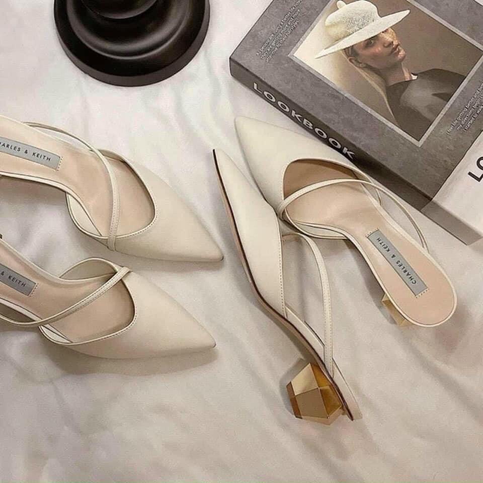 Xưởng sỉ Giày cao gót nữ , Guốc sục mũi nhọn Trong đá vuông trắng quai ngang đính đá gót ly 9p