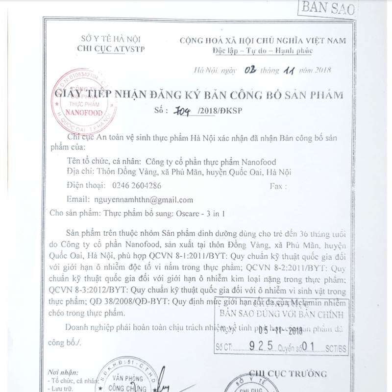 Sữa Bột Cho Bé Phát Triển Chiều Cao, Cân Nặng Và Trí Thông Minh OSCARE 3 Trong 1 IQ Hộp 400-900g 💥THÔNG TIN SẢN PHẨM - Tên sản phẩm: Sữa Bột OSCARE 3 Trong 1 IQ - Thương hiệu: OSCARE - Xuất xứ: Việt Nam - Trọng lượng: 900g, 400g - Hạn sử dụng: 24 tháng kể từ ngày sản xuất 💥THÀNH PHẦN - Bổ sung đầy đủ khoáng chất: Canxi, Magie, Kẽm, Iod, Photpho, Sắt, Kali… - Các loại vitamin A, D3, K1, vitamin nhóm B, acid folic. 💥CÔNG DỤNG - Cải thiện hệ tiêu hóa, ăn ngon miệng. - Tăng cân nhanh. - Phát triển chiều cao. - Tăng cường miễn dịch. - Phát triển trí não. - Oscare 3 IN 1 là sản phẩm được phát triển giúp thay thế bữa ăn phụ, bổ sung đầy đủ các vitamin và khoáng chất cho sự phát triển của trẻ. 💥ĐỐI TƯỢNG SỬ DỤNG - Trẻ từ 1 đến 10 tuổi. 💥HƯỚNG DẪN SỬ DỤNG - 1 muỗng 9g bột sữa pha với 50ml nước đun sôi để nguội (40 - 50 độ C) - Số lượng lần ăn có thể tham khảo trên ảnh chụp bao bì sản phẩm. - Số lần ăn chỉ mang tính tham khảo, có thể điều chỉnh theo nhu cầu của bé. - Sản phẩm dùng trong vòng 1 giờ sau pha, không cho trẻ ăn lại phần thừa bữa trước. - Pha đúng tỉ lệ hướng dẫn để có thể đạt kết quả tốt nhất. - Sản phẩm này không phải là thuốc và không có tác dụng thay thế thuốc chữa bệnh. 💥BẢO QUẢN - Bảo quản nơi khô ráo, thoáng mát, tránh ánh nắng trực tiếp. - Tránh nơi có nhiệt độ khắc nghiệt, đóng nắp sau khi sử dụng. - Sử dụng sản phẩm trong vòng 4 tuần sau khi mở nắp. - Để xa tầm tay của trẻ em. 💥CAM KẾT CỦA OSCARE - Được hỗ trợ từ đội ngũ chuyên gia nhiều kinh nghiệm. - Sử dụng nguồn sữa chất lượng, an toàn , đầy đủ dưỡng chất. - Sản phẩm 100% chính hãng, có tem mác đầy đủ. - Giao hàng nhanh. 💥CHÍNH SÁCH CỦA OSCARE - 01 đổi 01 trong vòng 07 ngày nếu hàng hàng lỗi do nhà sản xuất. Lưu ý: Khi nhận hàng quý khách vui lòng quay video để được hỗ trợ xử lý đơn hàng tốt nhất. Công Ty TNHH Nano Healthtech Địa chỉ: Số BT 3.04 - KĐT Xuân Phương, Phường Xuân Phương, Quận Nam Từ Liêm, Hà nội. OSCARE là nhãn hiệu sữa bột lành tính, dễ sử dụng. Ngoài ra Oscare còn là dòng sữa bột công thức hàng đầu Việt Nam, mang đến nhiều dòng sản phẩm cho mọi lứa tuổi. Đảm bảo cho người Việt được sử dụng nguồn sữa chất lượng, an toàn và đầy đủ dưỡng chất. #oscare #suabot #suacongthuc #suabothotrosuckhoe #suahop #suachobe #suabot #suabosungdinhduong #suachobosungduongchat #suachonguoitu1den10tuoi #suabotnhapkhau #suabotOSCARE #suabotchobeOSCARE #sua3trong1 #suanhapkhau #suatotchobe #suachobetu1den10tuoi