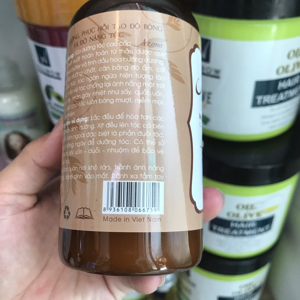 Sữa dưỡng, phục hồi tạo độ bóng cho tóc Azona 250ml Công dụng: Sữa dưỡng tóc cao cấp được chiết xuất hoàn toàn từ thảo dược quý hiếm Shea butter và tinh dầu hoa hướng dương, cung cấp dưỡng chất , cân bằng độ ẩm , cải thiện cấu trúc tóc ngăn ngừa hiện tượng lão hóa tóc