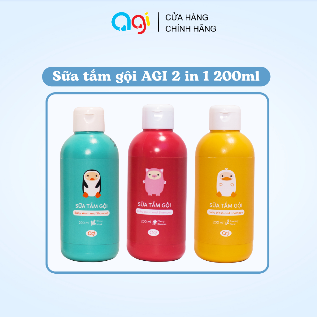 Dung tích : 200ml Hương hoa anh đào / Hương phấn / Hương cỏ xạ hương An toàn cho bé Không gây kích ứng da 100% nguyên liệu nhập khẩu từ Hàn Quốc Sữa tắm gội Agi là sản phẩm vệ sinh cho bé tích hợp sữa tắm và dầu gội hai trong một mang đến sự thuận tiện trong việc
