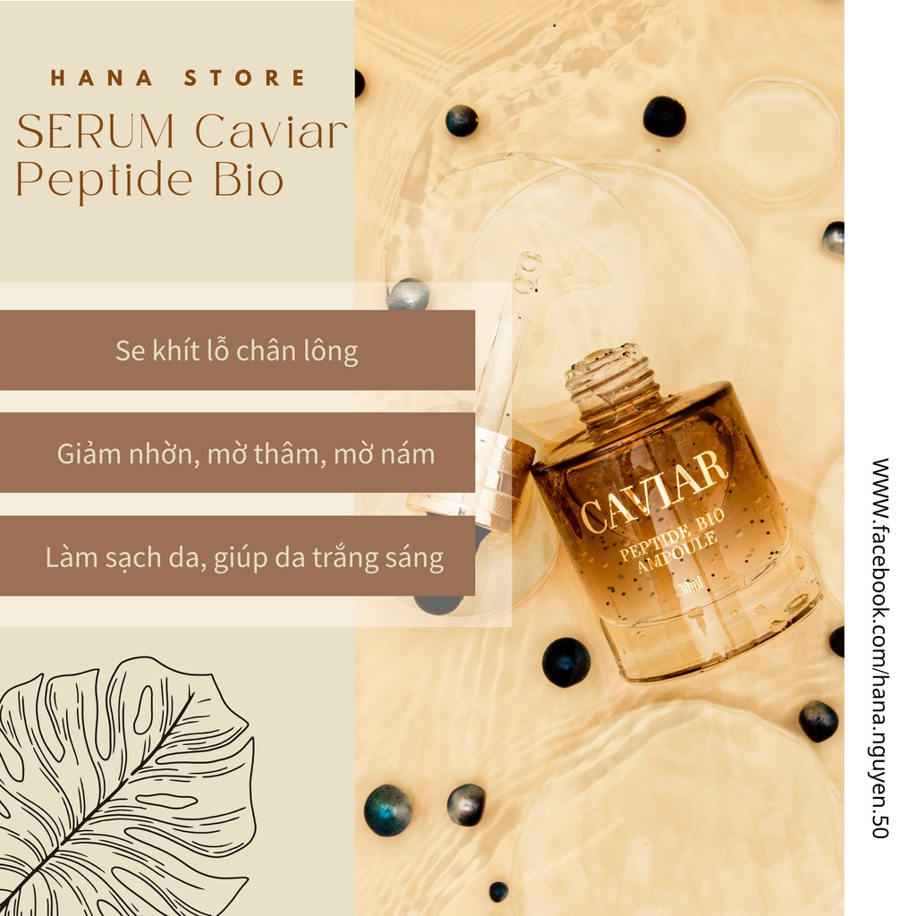 Tinh chất trứng cá tầm Caviar : giúp mờ thâm, nám, tái tạo trẻ hóa da Peptide Bio: xây dựng lại collagen,giảm nếp nhăn và duy trì vẻ trẻ trung và cung cấp độ ẩm cho da GS Levan – LMW: được biết là hoạt chất giúp căng bóng da tức thời 28-30% ngay sau khi sử dụng sản phẩm hoặc liệu trình có chứa hoạt chất này. Acetyl Glycyl Beta-Alanine:Làm trắng nhanh, hạn chế đốm nâu, đồi mồi ,ức chế các enzyme tạo thành melanin Vitamin B3: dưỡng da trắng sáng, giảm nhờn ở da, bảo vệ da khỏi tác hại của tia UV. Công dụng chính của sản phẩm: Chiết xuất từ trứng cá tầm đen thẩm thấu sâu tới trung bì của da giúp Hỗ trợ mờ thâm nám, tàn nhan Căng da, cấp ẩm tức thời bảo vệ sợi elastin tăng độ đàn hồi cho da Tái tạo và giảm nhăn trẻ hóa bề mặt da . Giữ ẩm cho da luôn mịn màng, Mờ thâm, mờ nám, mờ tàn nhan, chống nhăn, da không đều màu Da khô sạm Làm sạch da Giúp da trắng sáng Làm da dịu lại trước những tác động của môi trường Se khít lỗ chân lông vượt trội cấp ẩm dành cho làn da khô thiếu nước không được sáng khỏe. Peptide Bio 2% kích thích sản xuất collagen mang lại làn da rõ ràng hơn, đồng đều hơn. Rất thích hợp cho làn da sau khi lăn kim, đang trong quá trình hồi phục da, da mẩn cảm, da ửng đỏ, làm dịu da tức thời. Hướng dẫn sử dụng: Sử dụng serum thoa đều lên da hằng ngày 2 -3 để cấp ẩm, mờ nám, thâm, căng bóng da Thoa kem dưỡng da hoặc kem chống nắng (nếu có) Sử dụng đều hằng ngày rất tốt cho da vì đây là sản phẩm giúp da căng khỏe, tăng tính đàn hồi cho da.Đặc biệt là những làm da đổ dầu nhiều do thiếu ẩm, sử dụng serum phủ liên tục lên bề mặt da giúp da cân bằng lượng dầu tức thời sau 5-10 phút, giúp da mềm mịn. Dưỡng chất Levan Gs sẽ tạo lớp màng sinh học, bao phủ làn da, tạo hàng rào bảo vệ da tiếp xúc với môi trường bên ngoài, làm chậm quá trình đứt gãy collagen và sợi eslatin , từ đó làm chậm quá trình lão hóa da, là nguyên nhân chính gây nám, sạm của da. Lưu ý: Mỗi lần tối đa lưu sản phẩm trên da tối đa 4 tiếng.Sau đó vệ sinh da sạch rồi thoa lại lớp mới dưỡng mới để làn da được hấp thụ dưỡng chất , trẻ đẹp nhanh sau 1 liệu trình sử dụng.