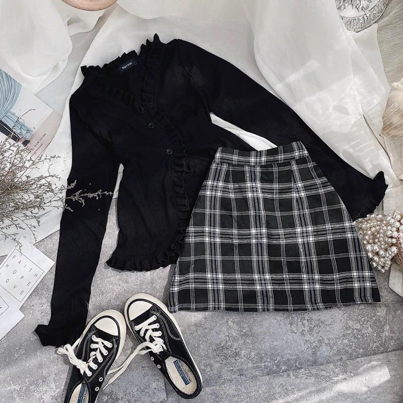 SET ÁO BÈO ĐEN CHÂN VÁY CARO