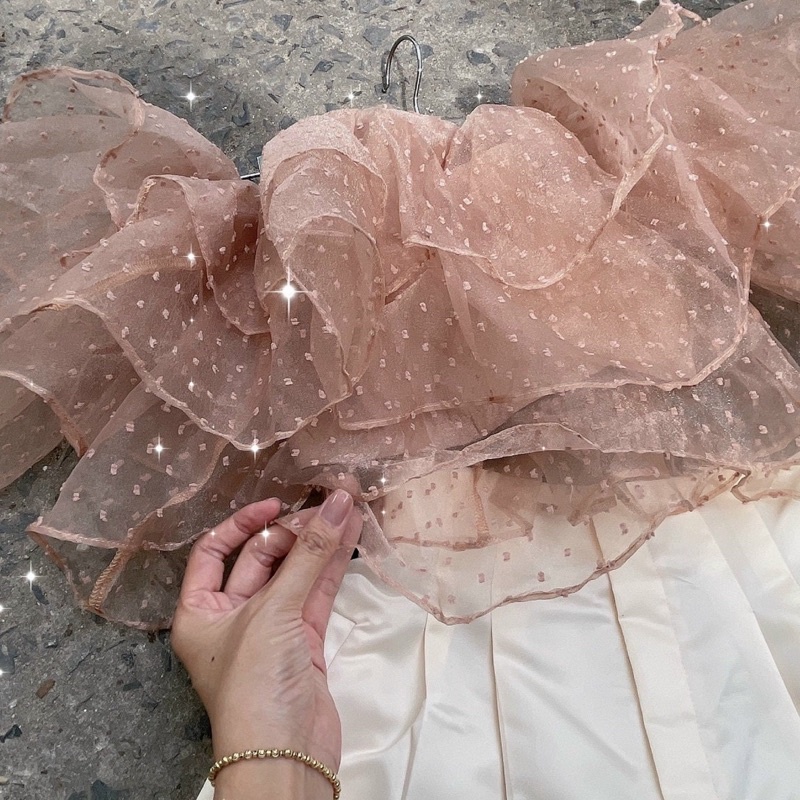 Set áo trễ vai nhún tay rời kèm chân váy voan tầng - Bộ 2 món áo bẹt vai kèm chân váy