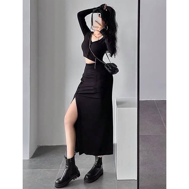 Set Áo Tay Dài Cổ Tim Kẻ Sọc Xẻ Tà Trước Kèm Chân Váy / Set váy sang chảnh dạo phố năng động
