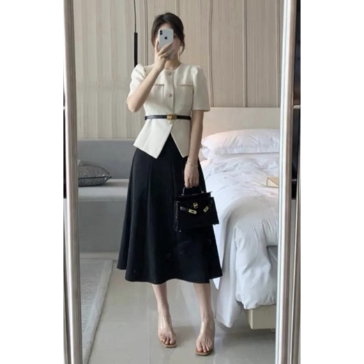 Set áo váy công sở S019 sang chảnh ICHIC cổ tròn có cúc ẢNH THẬT KHÔNG KÈM ĐAI