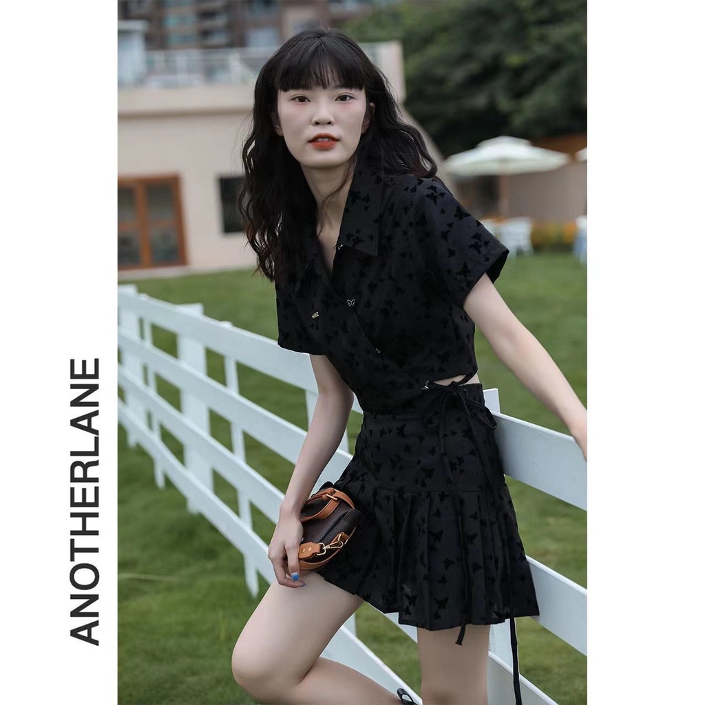 Set áo + váy xếp ly hai mảnh của phụ nữ mùa hè Retro Pháp