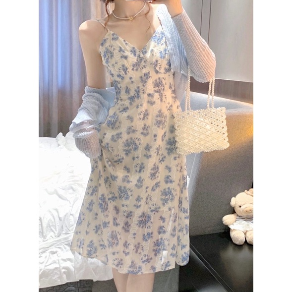 Set Đầm Hoa Xanh Ren 2 Dây Cúc Bọc + Áo Khoác Len Mỏng Xanh Nhạt Retro