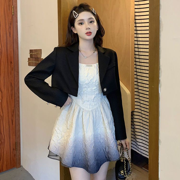 Set hai món với đầm hai dây và áo khoác đơn giản thời trang trẻ trung dành cho nữ