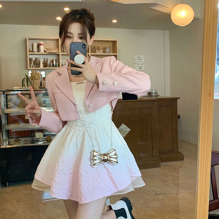Set đầm và áo khoác phối nơ lớn thười trang mùa thu xinh xắn cho nữ