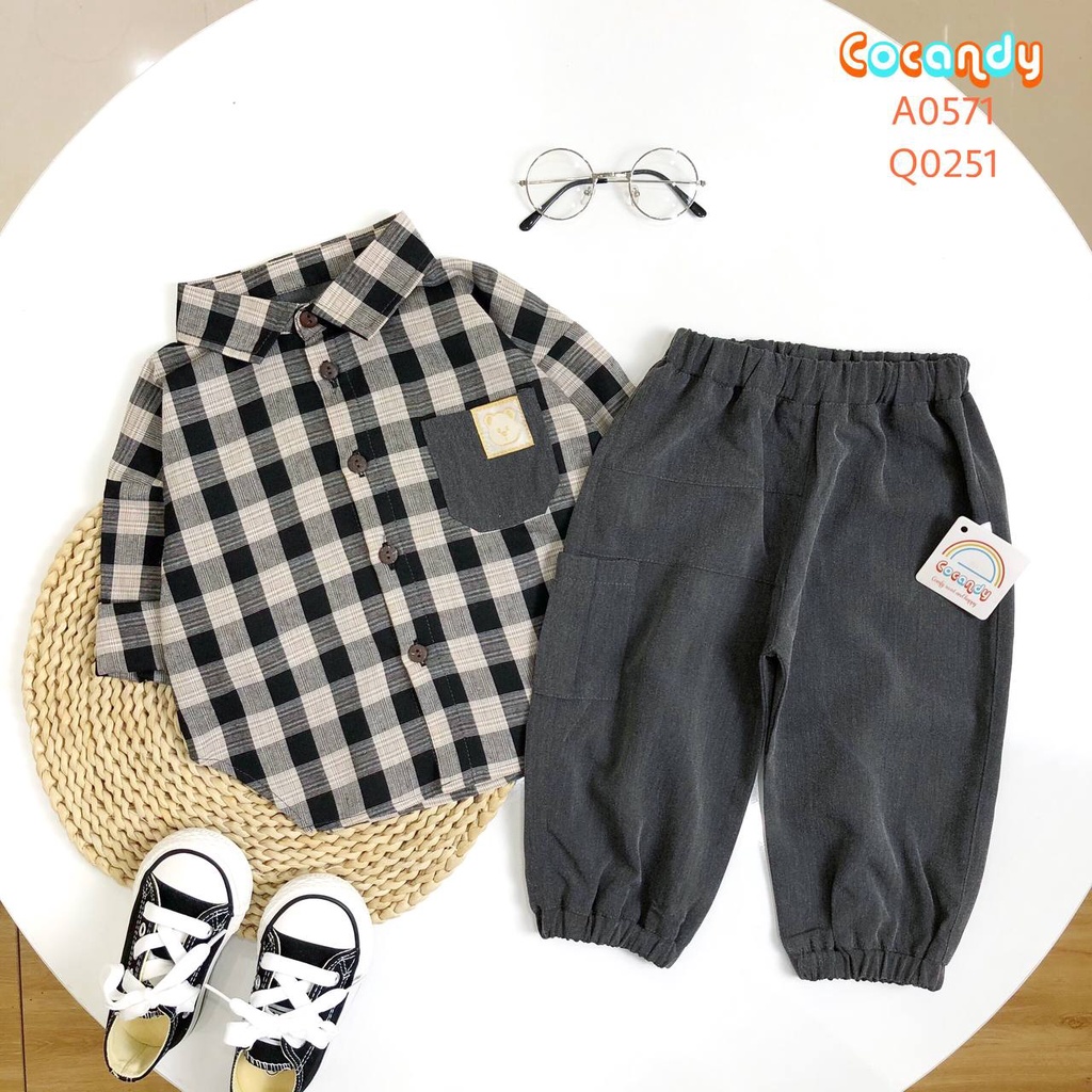 Set đồ cho bé -Áo dài ĐEN caro túi ngực hình gấu, áo thun trắng, Quần đũi ĐEN cúc lệch của COCANDY mã A0571,A136A,Q0072
