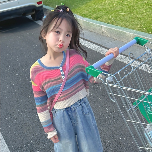 Set Đồ Mùa Xuân 2023 Hai Món Gồm Áo Thun Kẻ Sọc + Quần Jeans Ống Rộng Phong Cách Phương Tây Cho Bé Gái