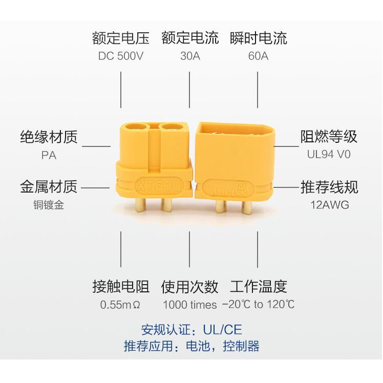 10 x Đầu nối phích cắm nâng cấp Amass XT60U XT60 với phích cắm chuối mạ vàng 3,5 mm cho thuyền ô tô Drone Rc (5 cặp) Thương hiệu: Amass Tên khoản mục: XT60u Chất liệu cơ thể: Đồng mạ vàng Chất liệu bên trong: Nylon / PA Kháng bên trong: 0,56mΩ Max. Rc / MC: 60A / 100A Trọng lượng: 4,92g Lực kéo / 600: 3kg Khả năng chịu nhiệt độ: -20°C ~ 120°C Khuyến nghị sử dụng: 3000 lần Đề xuất thông số cáp: 12AWG, 4,5mm Khuyến nghị Thông số hàn: 480°C / 3S 10 x Đầu nối phích cắm nâng cấp Amass XT60U XT60 với phích cắm chuối mạ vàng 3,5 mm cho thuyền ô tô Drone Rc (5 cặp)