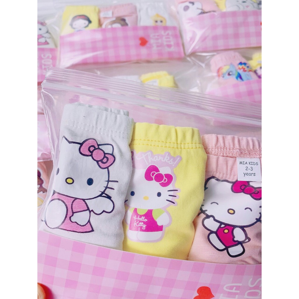 Set 3 quần chíp đùi cho bé gái lô mới tinh, toàn hình xinh. Chất liệu cotton mềm mát cho bé, co giãn tốt, bảng màu in hình cute như Kitty - Elsa - Mickey - Pony,... Dây chun mỏng nhẹ, bé mặc êm lắm. Form đẹp 10-30kg Size 2-3Y (10-12kg) Size 4-5Y (13-16kg) Size 6Y (17-21kg) Size 8Y (22-26kg) Size 10Y (27-30kg)