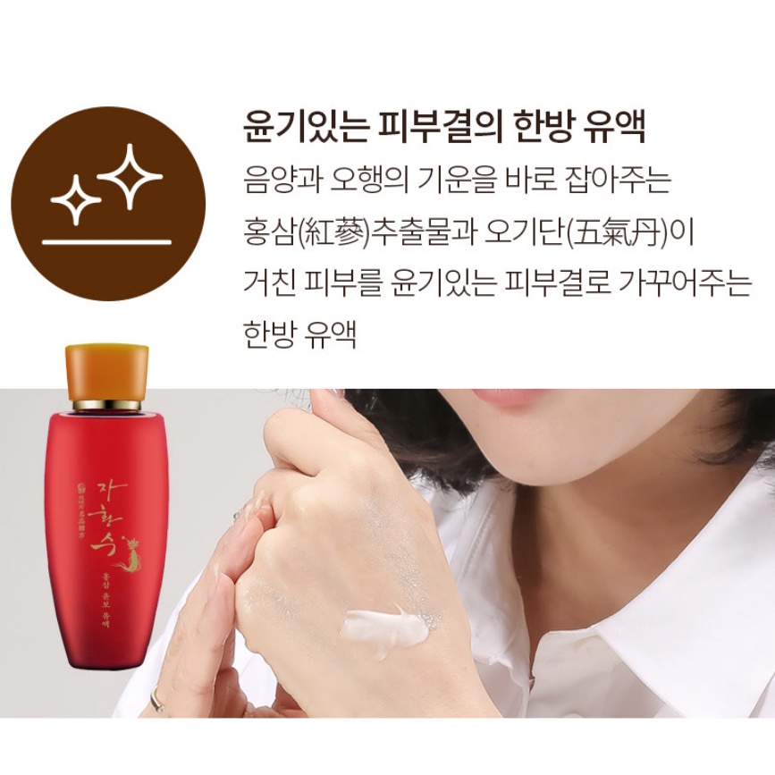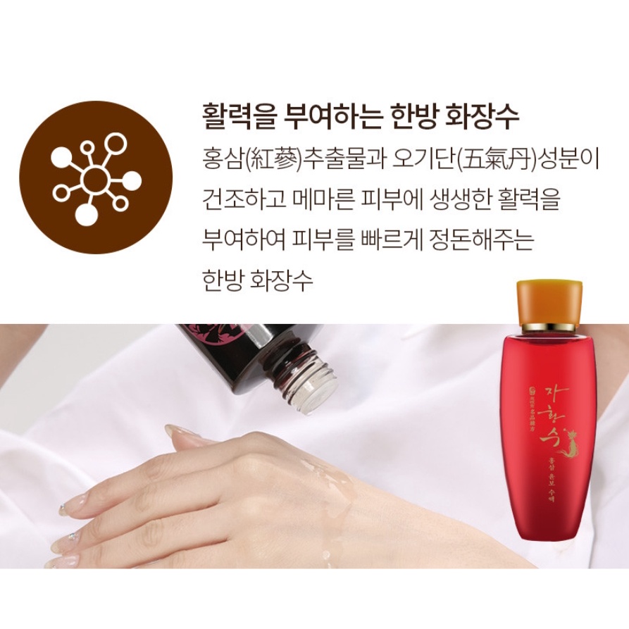 Thời gian giao hàng dự kiến cho sản phẩm này là từ 7-9 ngày Toner JAHWANGSU hồng sâm 30ml. Sữa dưỡng JAHWANGSU hồng sâm 30ml. Kem dưỡng tạo độ đàn hồi Emulsion 10ml (Được chứng nhận chống nếp nhăn hiệu quả) Tinh chất JAHWANGSU hồng sâm. Kem dưỡng da mắt JAHWANGSU hồng sâm. Với chiết xuất từ tinh chất hồng sâm Hàn Quốc, bí quyết của làn da đẹp tươi trẻ rạng ngời cùng các thành phần thảo dược như nhân sâm kết hợp acanthopanax, nấm linh chi, nhung hươu dựa trên nguyên lý cân bằng âm dương của phương đông và các nguyên tố dựa trên nguyên lý thổ mộc hỏa kim, mỹ phẩm hồng sâm JAHWANGSU chăm sóc da bạn từ sâu bên trong, đào thải các độc tố có hại tích tụ sâu trong da và cân bằng nuôi dưỡng da.
