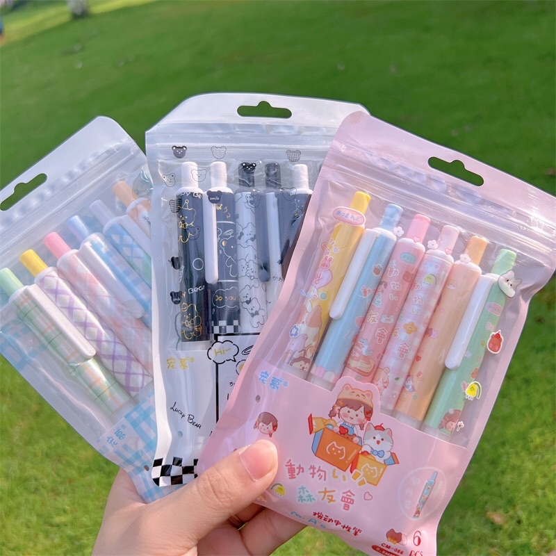Set 6 Bút Gel Hoạt Hình Ngòi 0,5mm Mực Đen Dễ Thương Bút Bi Bấm Văn Phòng Họa Tiết Cute