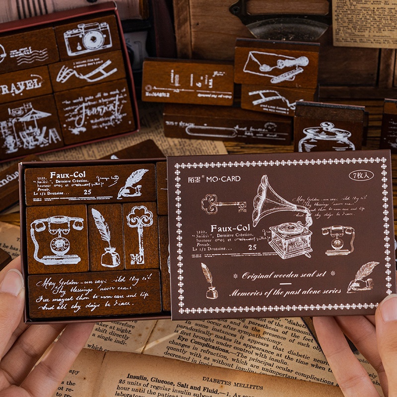 Set 7 Con Dấu Gỗ Phong Cách Retro Vintage Dùng Để Trang Trí Sổ Tay