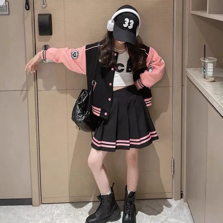 Set Bộ Đồ Nữ Áo Khóa CHICAGO 1989 Ngắn Tay Mix Quần Váy Bò Ống Rộng Xếp Ly Freesize