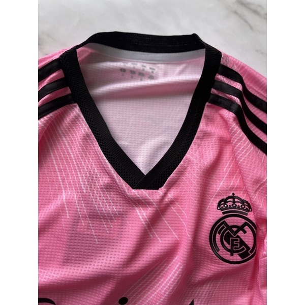 Set bộ quần áo thể thao bóng đá vải gai thái clb real áo hồng quần đen 2023