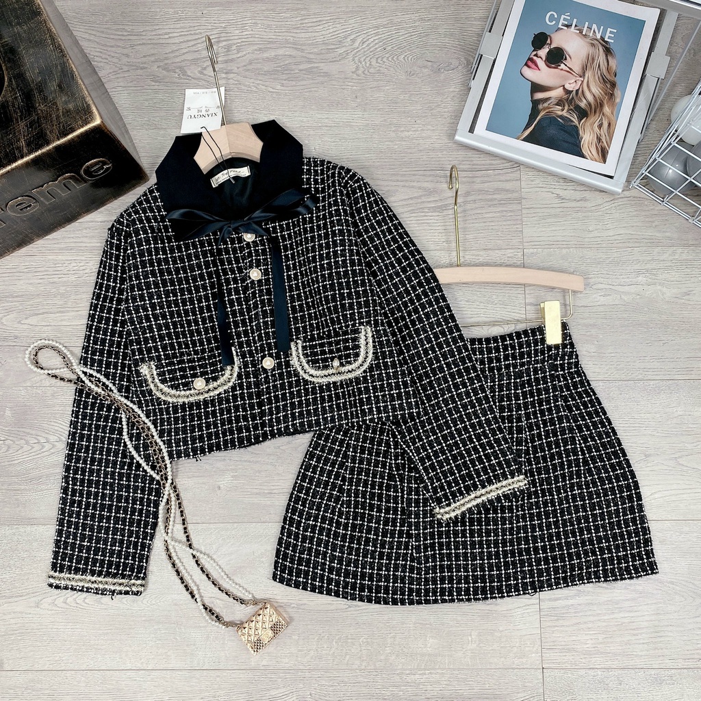 Set dạ túi nắp cổ nơ kèm chân váy xoè 2 màu