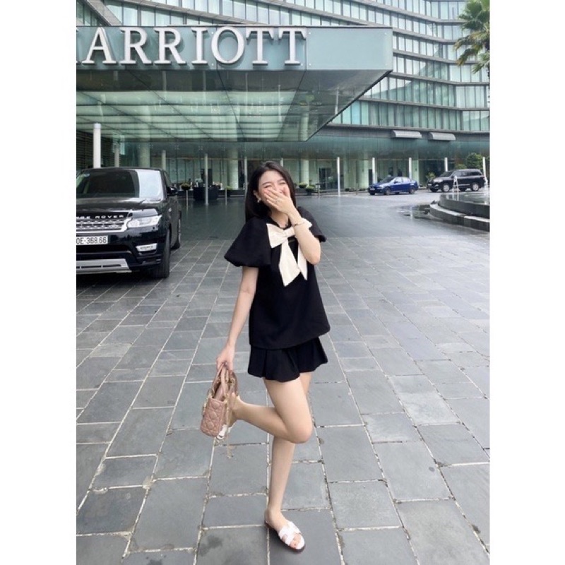Set quần giả váy xếp ly kết hợp áo tay bồng phối nơ