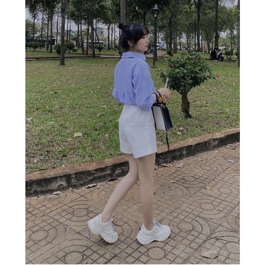 Set sơ mi tay lỡ kèm quần short trắng Áo sơ mi kẻ xanh vạt chéo cổ bẻ mix quần short cạp chun GUU House