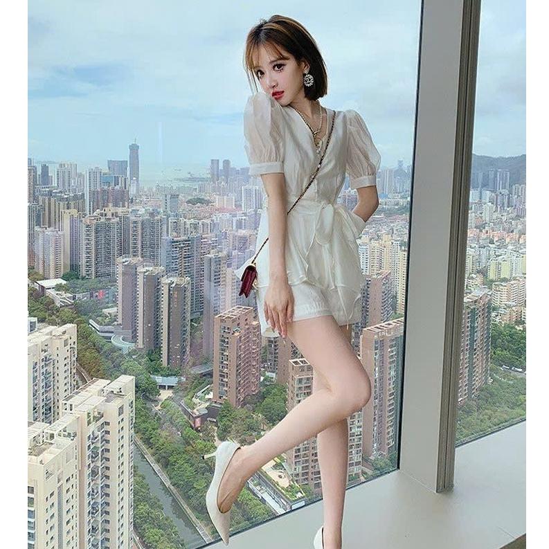Set bộ đi chơi,set áo trắng cổ V thắt nơ tay phồng quần short ngắn phong cách hàn quốc thanh lịch