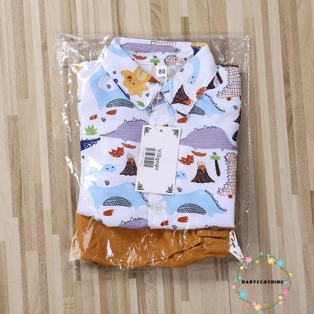 Set trang phục bé trai 2 món gồm áo sơ mi tay ngắn họa tiết khủng long và quần short thời trang